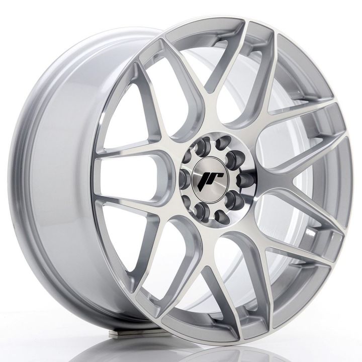 Japan Racing Wheels - JR18 Silver Machined (17x8 Zoll) - Gefertigt aus sieben riesigen Kreuzspeichenpaaren - Dezent konkaves Design - Tief eingelassene Lochkreisumrandung - Speichen erstrecken sich bis zur letzten Felgenhornkante - Angedeutetes Tiefbett wird durch die optisch aufgelegten Speichen ausgeprägt
